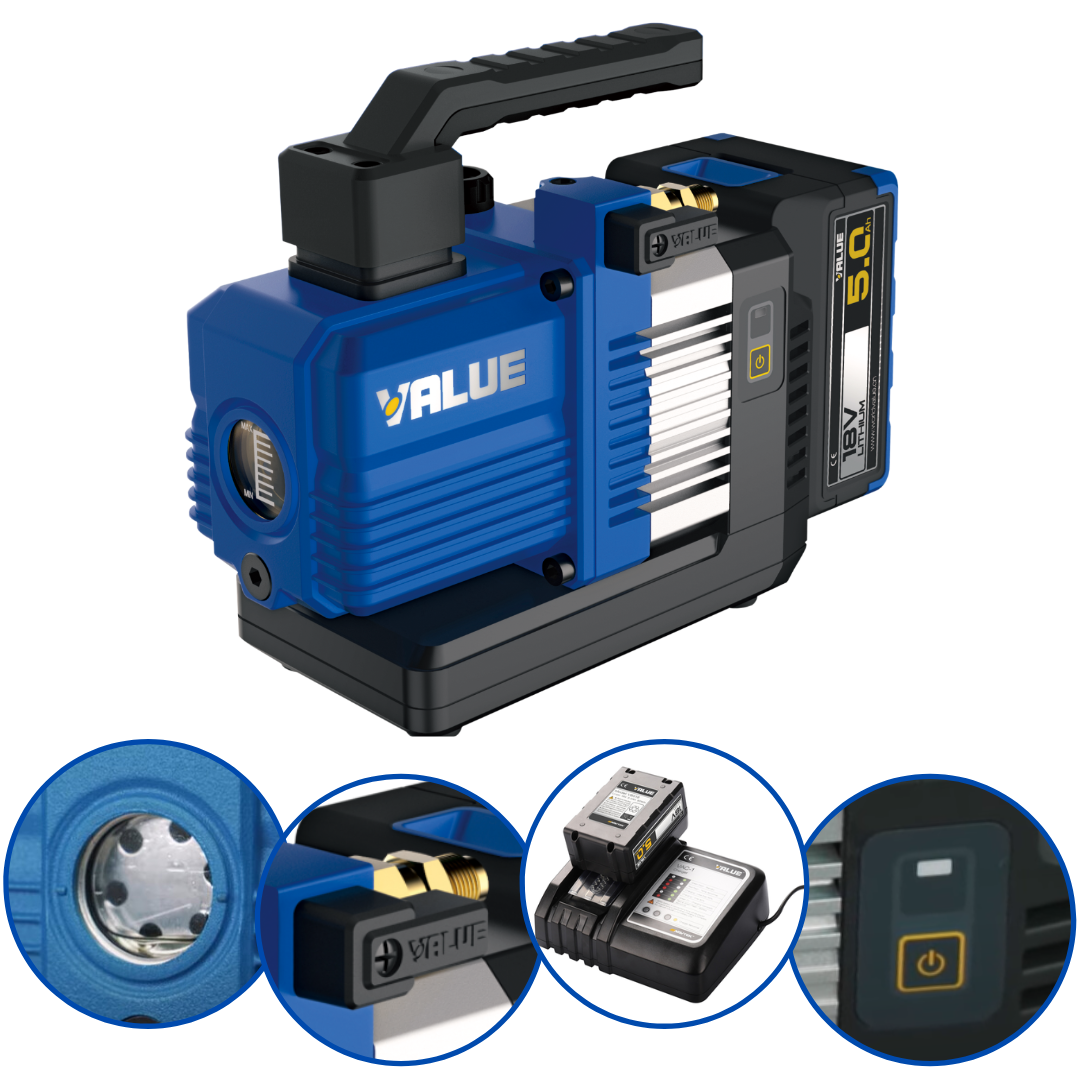 Pompa próżniowa to urządzenie służące do usuwania pozostałości gazów w zamkniętej przestrzeni (instalacji). Prezentowany model zasilany jest 18 V litowym akumulatorem 5 Ah, który pozwala na pracę pompy przez 75 minut. Akumulatorowa pompa próżniowa NAVTEK VRP-2SLi 56l/min stosowana jest w klimatyzacji i chłodnictwie, bo cechuje się wysoką niezawodnością, zwartą budową, oraz lekką konstrukcją (2,7kg-bez baterii) umożliwiającą wygodne przenoszenie pompy do miejsca pracy. Prezentowana akumulatorowa pompa próżniowa NAVTEK VRP-2SLi 56l/min jest jednostopniową pompą próżniową pozwalającą na uzyskanie poziomu próżni rzędu 99,99% co przekłada się na głębokość próżni równe 150 mikronów. Sprzęt jest wyposażony w wziernik do kontrolowania poziomu oleju oraz ręczny zwrotny. Specjalnie zaprojektowany silnik pozwala na uzyskanie głębszej próżni przy niewielkich wymiarach produktu. Akumulatorowa pompa próżniowa NAVTEK VRP-2SLi 56l/min charakteryzuje się również niewielkimi gabarytem. Wraz z baterią urządzenie ma wymiary 233x190x90 mm.