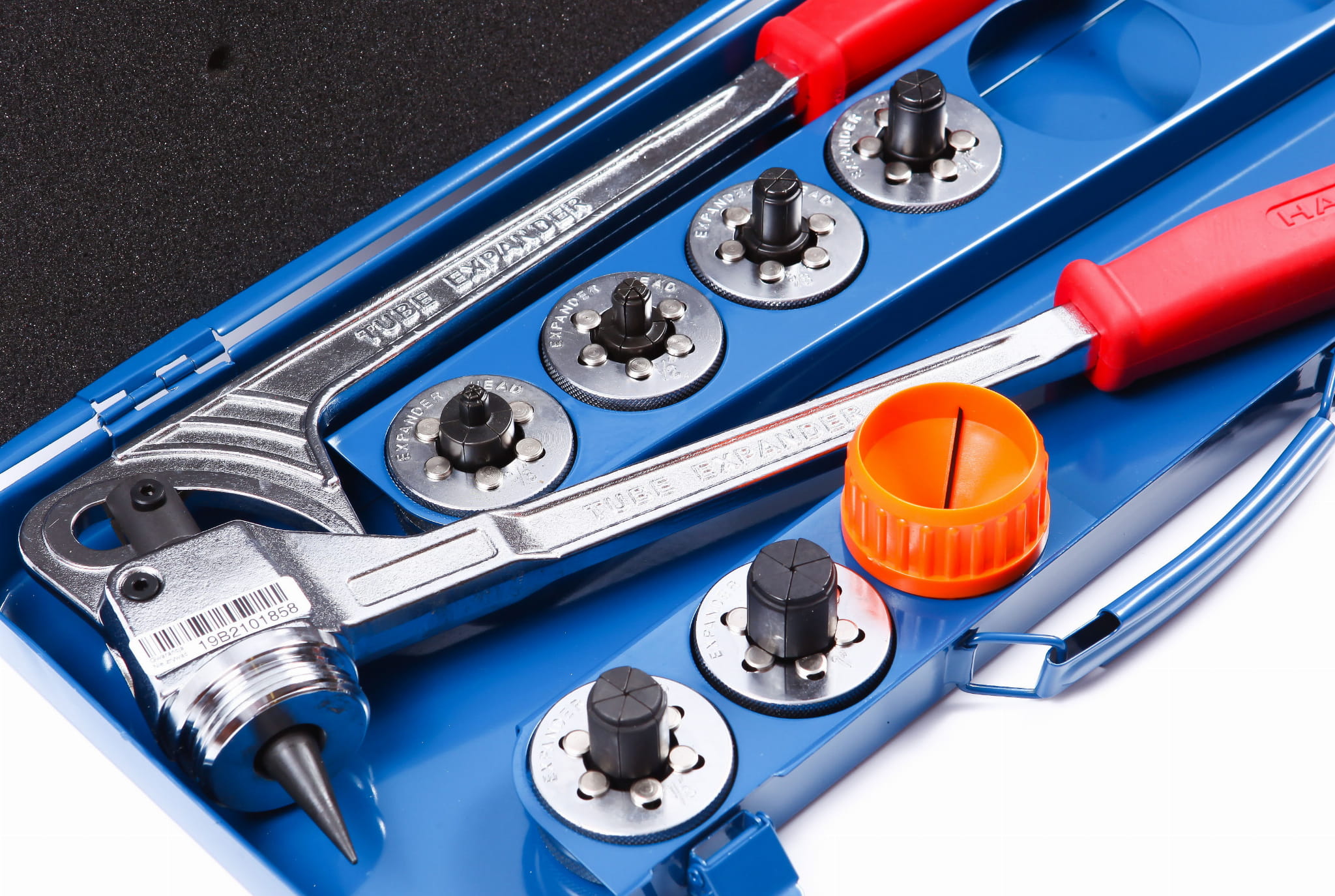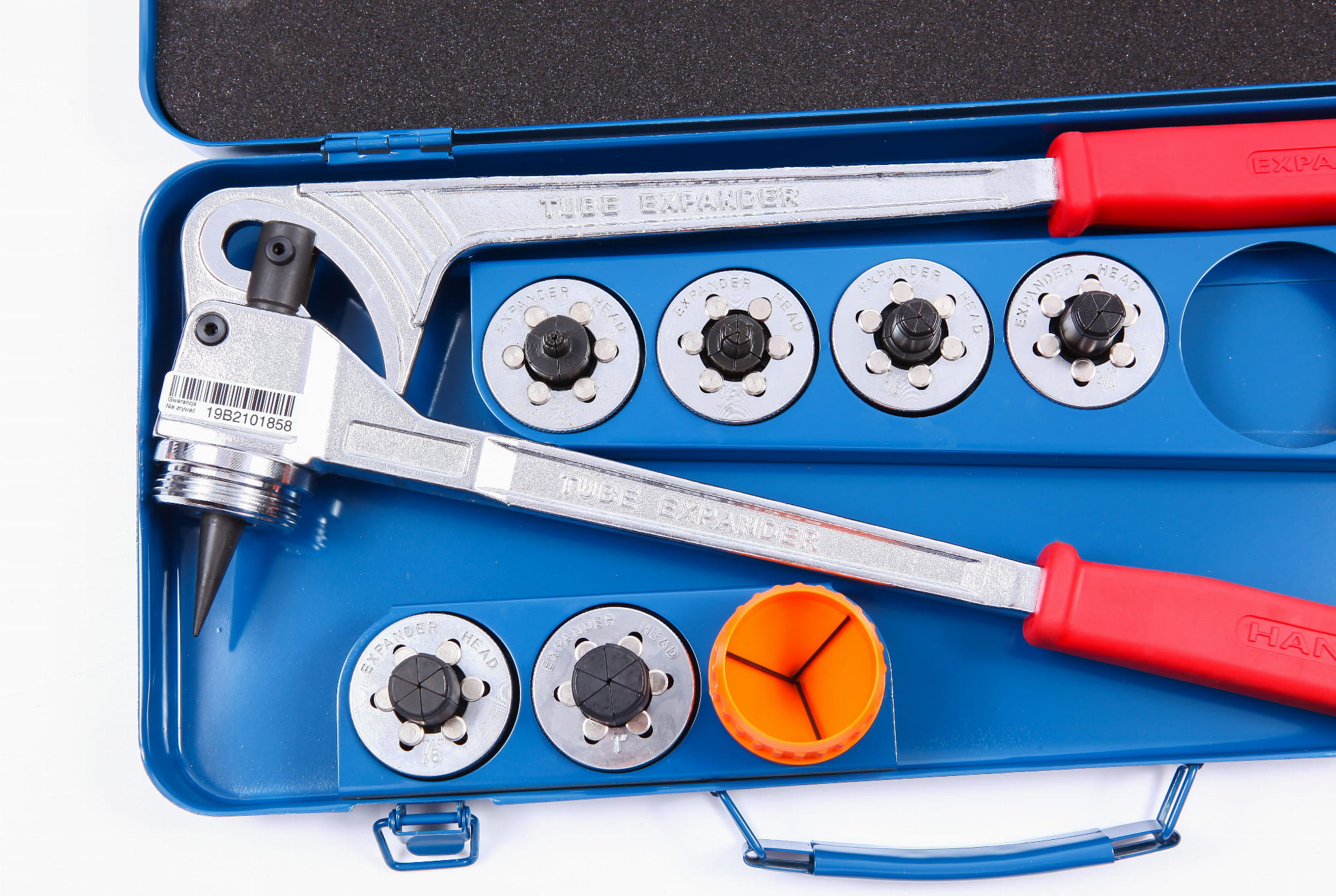 Ręczny zestaw do roztłaczania rur - ekspander do rur miedzianych z kompletem wkładek w solidnej  metalowej walizce.