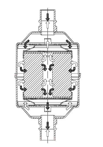 Dwukierunkowy filtr odwadniający CASTEL jest zbudowany w taki sposób, aby przepływ czynnika ciekłego następował zawsze od strony zewnętrznej wkładu filtra do środka. W ten sposób wszystkie cząstki zanieczyszczeń są zatrzymywane niezależnie od kierunku przepływu.