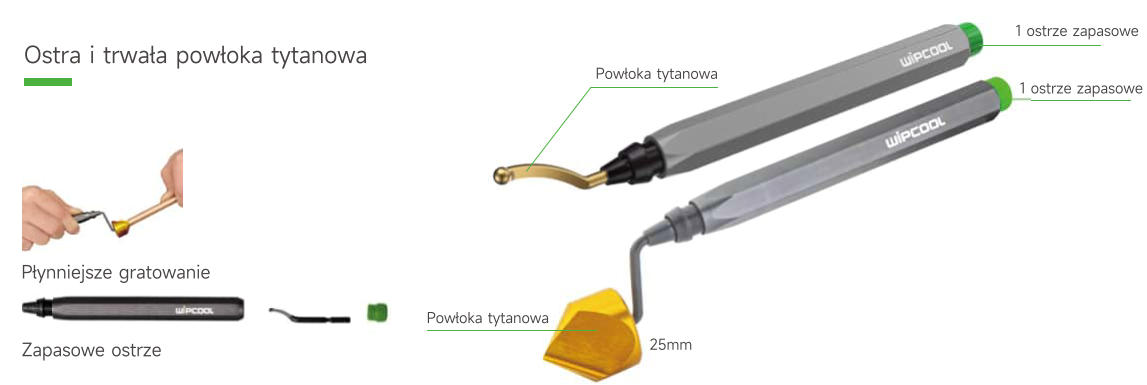 Dzięki tytanowemu pokryciu powierzchnia ostrza jest chroniona przed ścieraniem, co przekłada się na dłuższy czas użytkowania produktu i jego niezawodność.