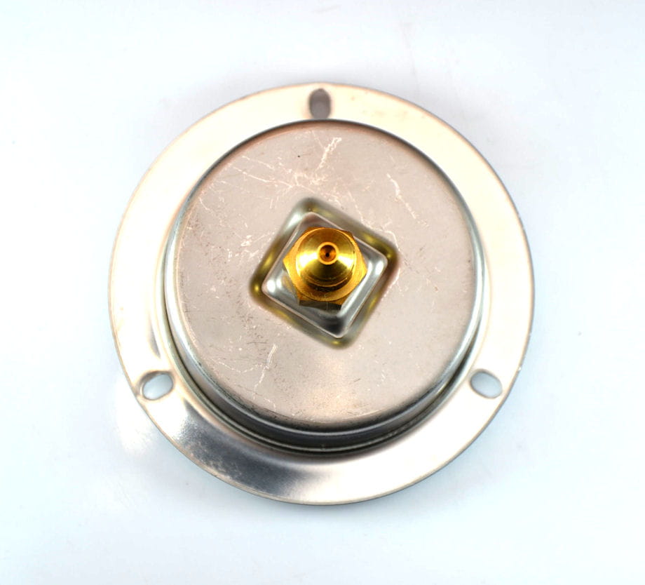 Manometr ze stalową ramą i skalą wypełnioną gliceryną.