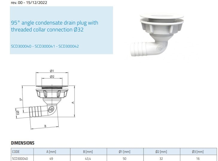 Jest to odpływ do odprowadzania skroplin z klimatyzatora, pompy ciepła . Wykonany jest z wysokiej jakości tworzywa sztucznego, dzięki czemu jest trwały i odporny na uszkodzenia. Kąt nachylenia odpływu to 95°, co ułatwia odprowadzanie skroplin do zbiornika lub kanalizacji.