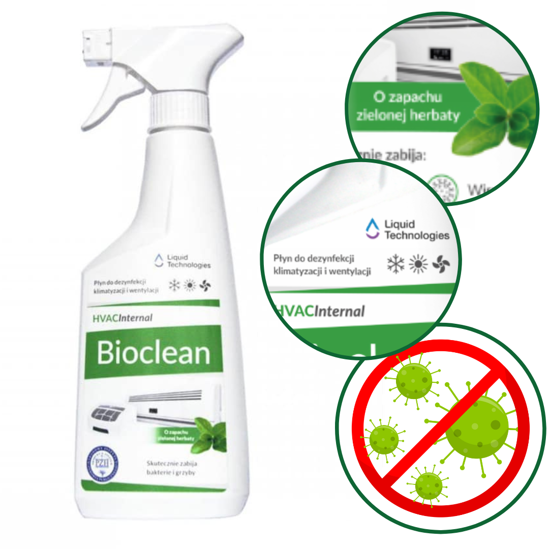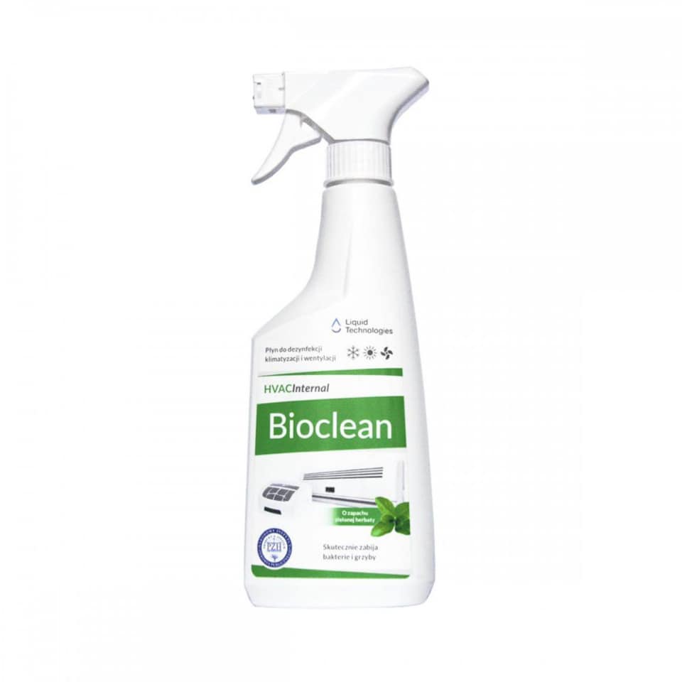 HVAC Internal Bioclean to uniwersalny produkt do czyszczenia parowników i tac skroplinowych wewnętrznych jednostek urządzeń klimatyzacyjnych, klimatyzacyjno-wentylacyjnych a także filtrów powietrza. Skutecznie usuwa zanieczyszczenia występujące w klimatyzacji i wentylacji bytowej: kurz, pył, pozostałości dymu tytoniowego oraz osady organiczne zalegające na parowniku i tacy skroplinowej. Usuwa przykre zapachy i skutecznie dezodoryzuje klimatyzację zapewniając przyjemny, świeży zapach.