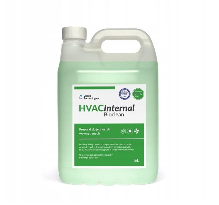 HVAC Internal Bioclean to uniwersalny produkt do czyszczenia parowników i tac skroplinowych wewnętrznych jednostek urządzeń klimatyzacyjnych, klimatyzacyjno-wentylacyjnych a także filtrów powietrza. Skutecznie usuwa zanieczyszczenia występujące w klimatyzacji i wentylacji bytowej: kurz, pył, pozostałości dymu tytoniowego oraz osady organiczne zalegające na parowniku i tacy skroplinowej. Usuwa przykre zapachy i skutecznie dezodoryzuje klimatyzację zapewniając przyjemny, świeży zapach.