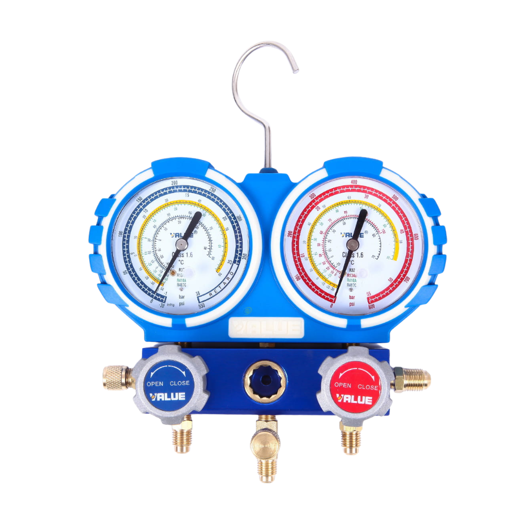 Profesjonalny zestaw manometrów przeznaczony do pracy z czynnikiem chłodniczym R32. Zapewnia precyzyjny pomiar ciśnienia oraz pełną kontrolę parametrów pracy instalacji klimatyzacyjnej. Solidna konstrukcja i czytelne manometry gwarantują trwałość oraz łatwość obsługi w codziennej pracy instalatora.