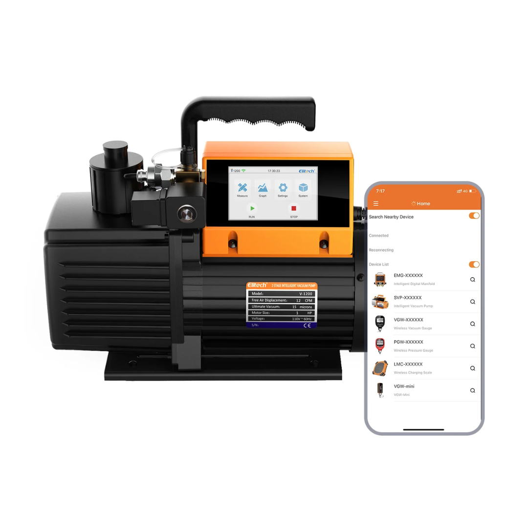 Dzięki inteligentnemu sterowaniu i łączności z aplikacją Elitech Tools (Bluetooth) użytkownik może zdalnie monitorować i kontrolować pracę pompy, obserwować przebieg obniżania próżni w czasie rzeczywistym oraz eksportować dane pomiarowe. Solidna konstrukcja i dwustopniowy układ łopatkowy zapewniają szybkie osiąganie niskich poziomów próżni, co ułatwia przygotowanie układów chłodniczych do napełniania czynnikiem chłodniczym.