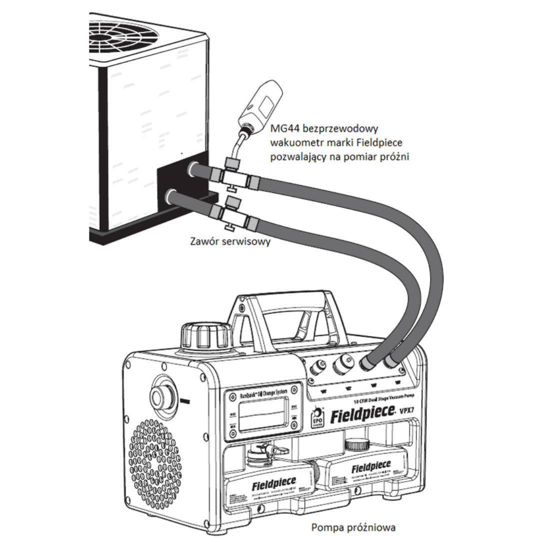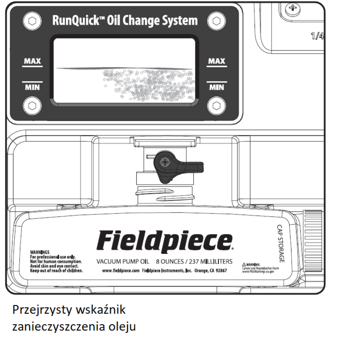 | Zgodność z olejem | Olej do pompy próżniowej Fieldpiece (wysoko rafinowany i zoptymalizowany pod kątem prawidłowego uszczelnienia i smarowania) Numery części Fieldpiece: OIL8X3, OIL32, OIL128 |