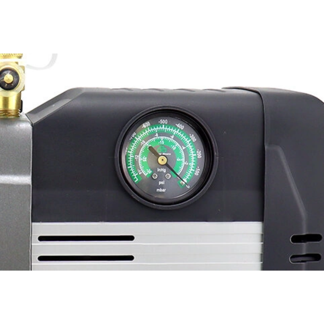 Zaawansowana pompa próżniowa z wbudowanym elektrozaworem i manometrem próżni, silnikiem DC bezszczotkowym, konstrukcją bez iskrzeń, wbudowanym filtrem, mosiężnym portem ssącym i dużym wskaźnikiem oleju.