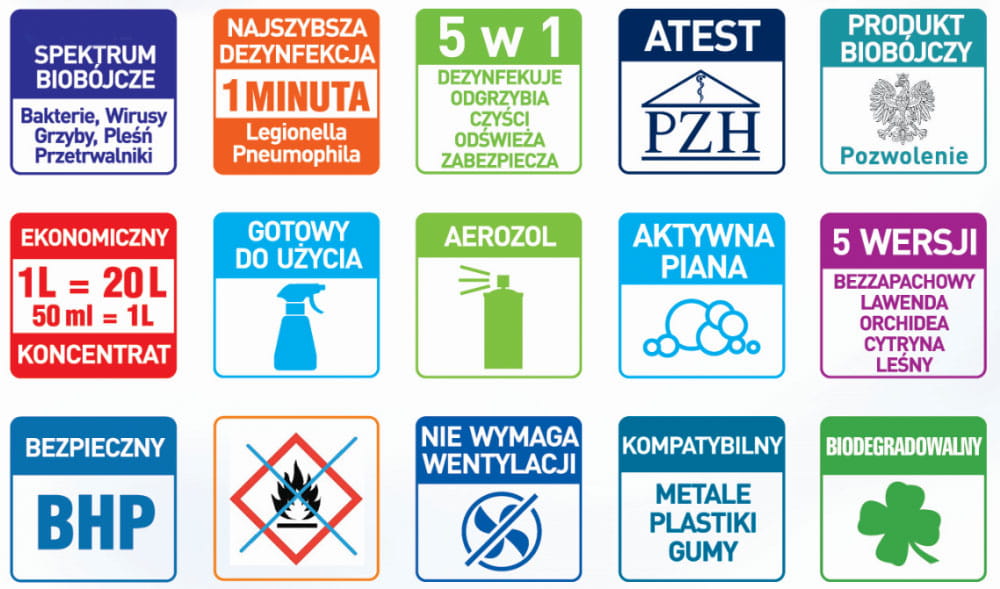 Działanie: Dezynfekcja z pełnym spektrum biobójczym, mycie, czyszczenie, usuwanie przykrych zapachów, odświeżanie powietrza, usuwanie plam,
