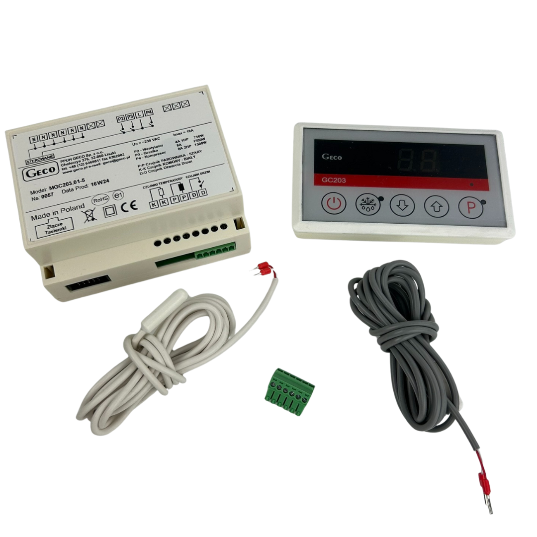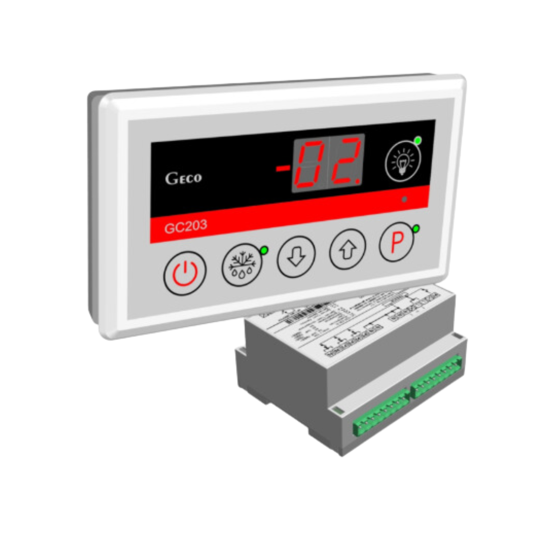 GECO GC-203.01 -sterownik 3-przekaźnikowy sterujący urządz.: kompresor/wentylator/grzałka lub zawór. Klawiatura panelu sterownika bez przycisku światła. Możliwość podłączenia czujnika otwarcia drzwi (mechanicznego lub magnetycznego) lub czujnika temperatury pełniącego funkcję termometru. Przeznaczony jest do sterowania urządzeniami chłodniczymi pracującymi zarówno w niskich, jak i wysokich zakresach temperatur. Dzięki dwuczęściowej obudowie GC203 może zostać zastosowany do każdego mebla i prostej komory chłodniczej. Pracujący pod bezpiecznym 5V napięciem panel sterujący może zostać zamocowany w dowolnym miejscu, bez potrzeby wycinania dodatkowych otworów i prowadzenia wielu kabli zasilających daleko od sterowanych urządzeń. GC203 ma możliwość pracy standardowo z dwoma czujnikami temperatury oraz w zależności od konfiguracji parametru, do sterownika można podpiąć dodatkowo trzeci czujnik temperatury lub czujnik otwarcia drzwi (magnetyczny lub optyczny). Wszystkie czujniki podłączone są do modułu wykonawczego i pracują one pod bezpiecznym 5V napięciem. Moduł sterownika posiada także cztery wyjścia umożliwiające bezpośrednie podłączenie urządzeń pracujących pod napięciem 230V. Znajduje zastosowanie w urządzeniach w których nie ma miejsca na zastosowanie tradycyjnych termostatów