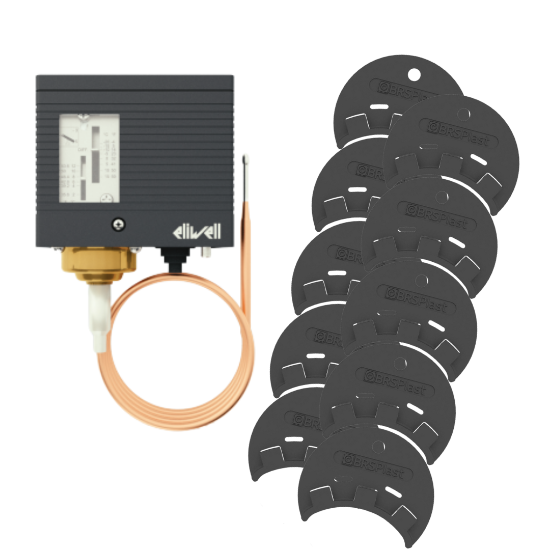 Zestaw zawiera termostat przeciwzamrożeniowy ELIWELL D16T15AFC6S200 oraz 10 uchwytów do kapilary BRSPLAST, co zapewnia kompleksowe rozwiązanie do zabezpieczenia nagrzewnic w instalacjach klimatyzacyjnych i wentylacyjnych przed skutkami niskich temperatur.