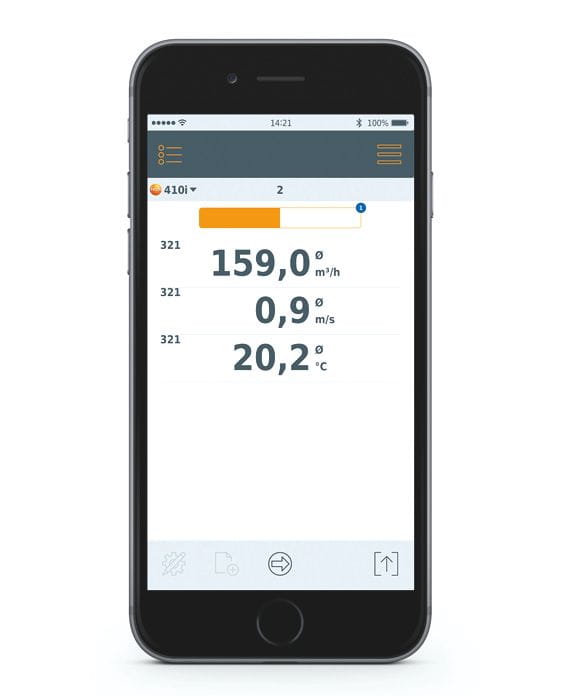 Konfiguracja pomiaru strumienia objętości jest naprawdę prosta z aplikacja mobilną, ponieważ można przeprowadzić parametryzację wylotu (wymiar, geometrii) intuicyjnie, jest to szczególnie przydatne podczas regulacji system wentylacji, pomiaru przepływy objętościowo, może być zweryfikowany i porównywany w wielu punktach pomiarowych.