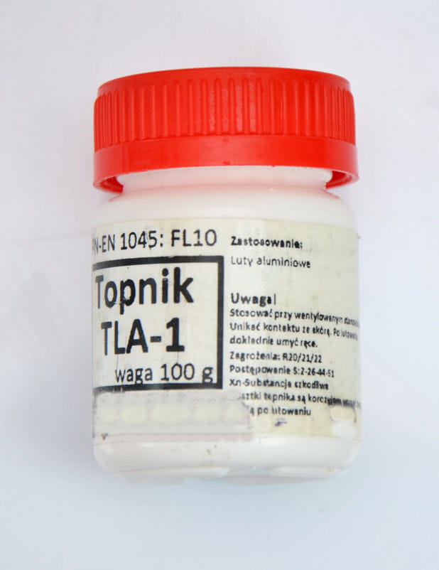 Higroskopijny topnik w do lutowania płomieniowego. Idealny do lutowania elementów stopów aluminium o zawartości do 2,5% magnezu w stopie.
