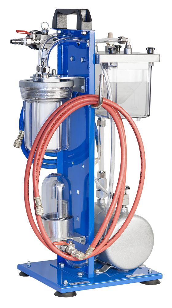 - W tym celu zamknij zawór na separatorze oleju, odkręć niebieski wąż odbierający środek czyszczący przy maszynie i usuń brudny środek do pojemnika przeznaczonego do tego celu.
