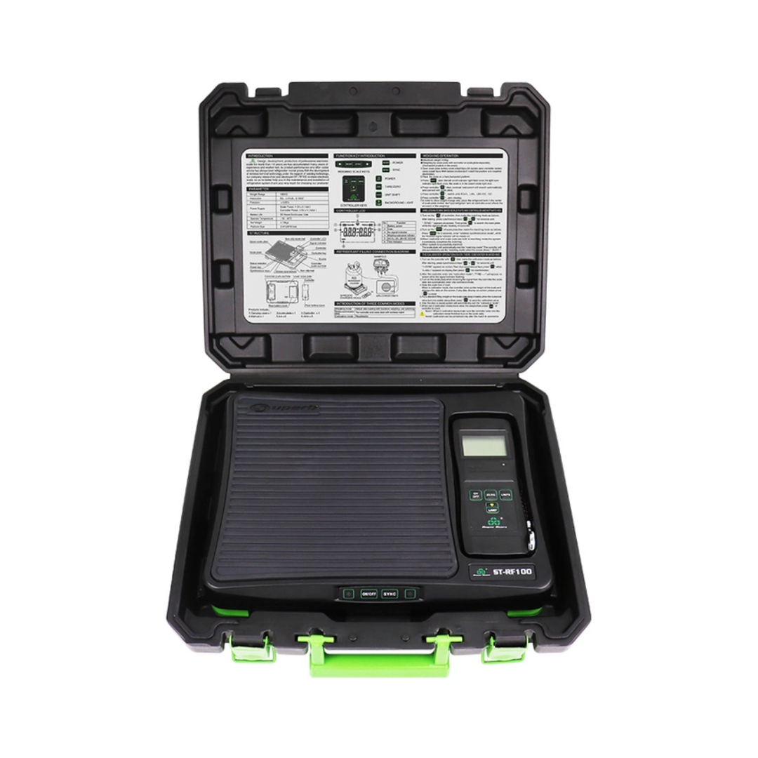 Model ST-RF100 umożliwia kontrolowane napełnianie układów chłodniczych i klimatyzacyjnych. Platforma wykonana ze stopu aluminium gwarantuje lekkość i trwałość, a precyzyjny czujnik wagowy zapewnia wysoką dokładność pomiaru. Bezprzewodowy kontroler z dużym wyświetlaczem zwiększa wygodę obsługi podczas pracy w terenie.