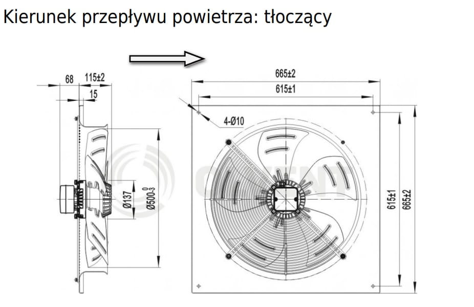 Wentylator przemysłowy osiowy tłoczący (pchający) OLVENT 500mm 230V wydmuchowy z płytą montażową.