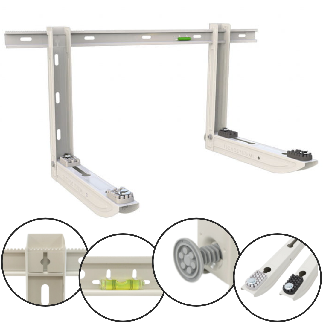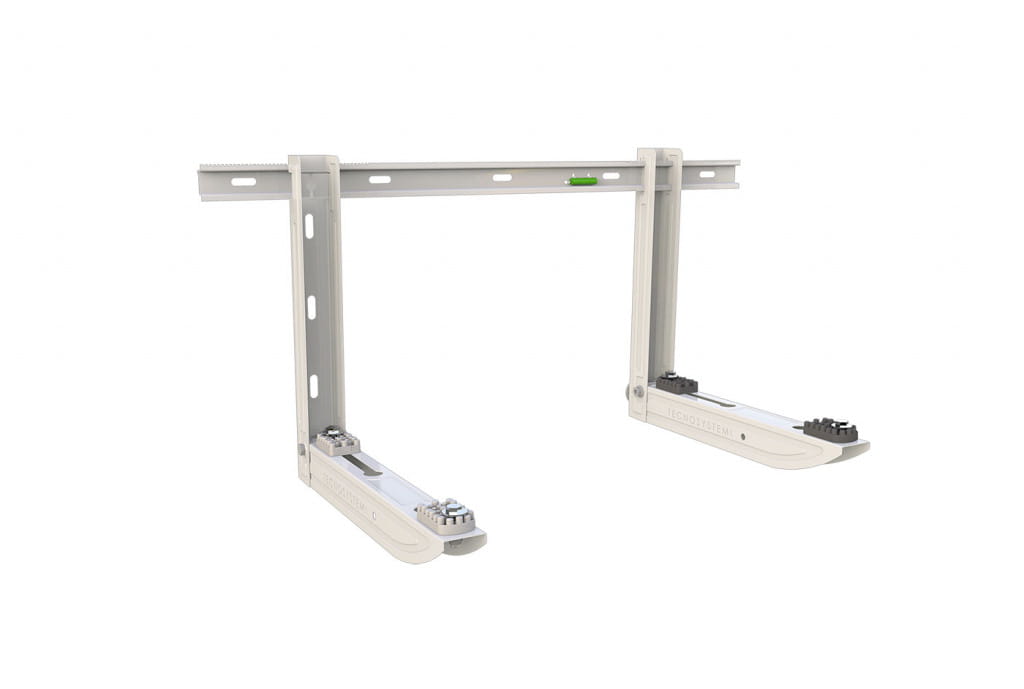 Składany wspornik do klimatyzatora SGL 140 EVO z belką montażową. Wspornik wykonany jest z ocynkowanego metalu, lakierowany metodą proszkową zapewnia wysoką odporność na warunki atmosferyczne.
