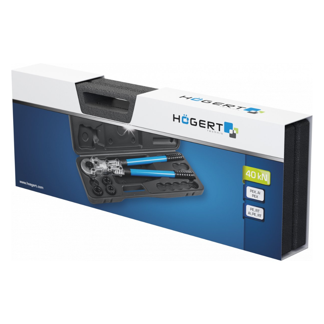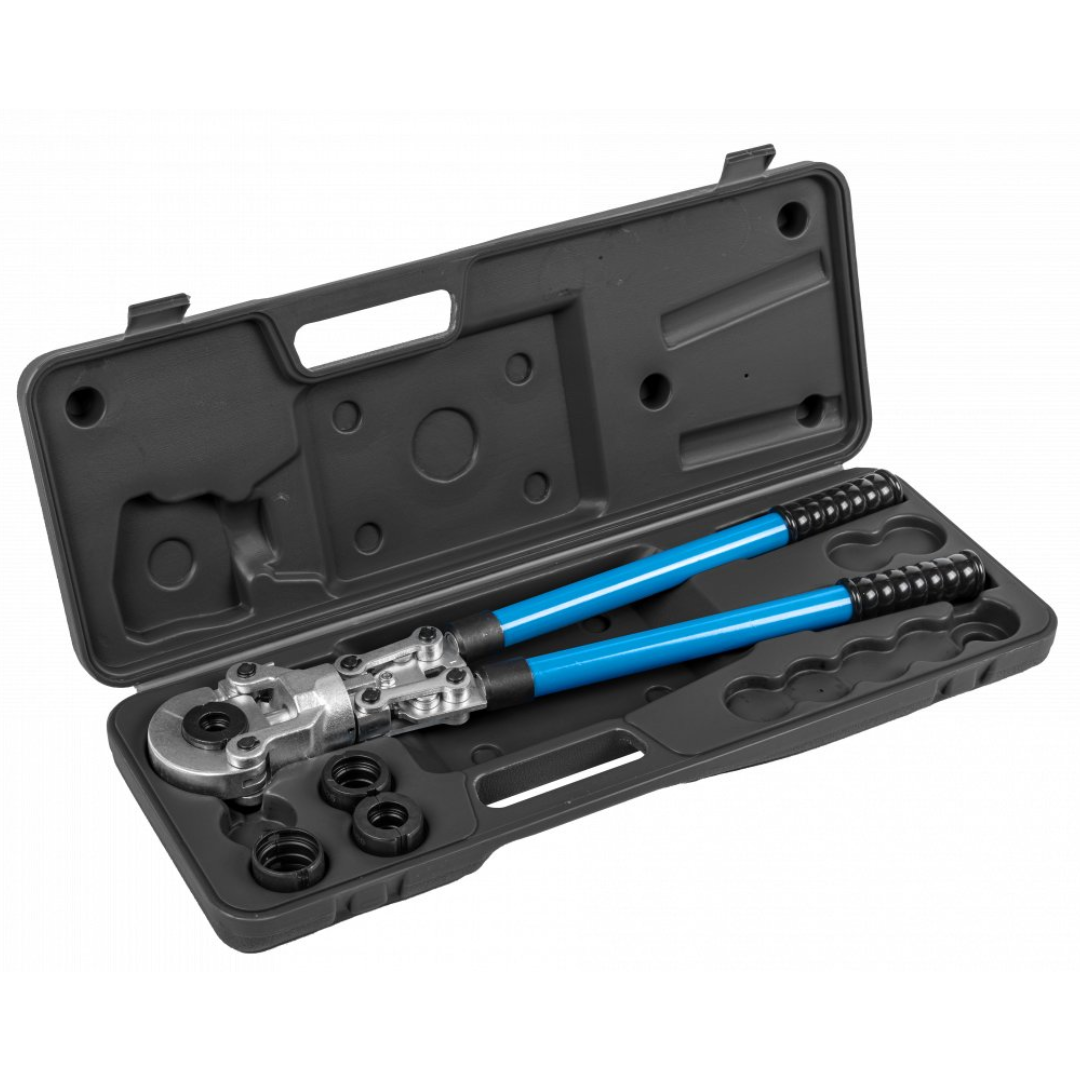 Ręczna praska do zaciskania złączek na rurach PEX-AL-PEX oraz PE-RT-AL-PE-RT. Teleskopowe rękojeści umożliwiające wydłużenie ich z 58 cm do 76 cm, zwiększając w ten sposób siłę konieczną do zakucia złączki. System szybkiej wymiany matryc pozwala w łatwy sposób wymienić matryce w zależności od potrzeb.