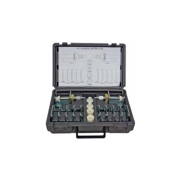 Zestaw podstawowych adapterów przeznaczony do sprawdzania szczelności oraz płukania układów klimatyzacji stacjonarnej i samochodowej.