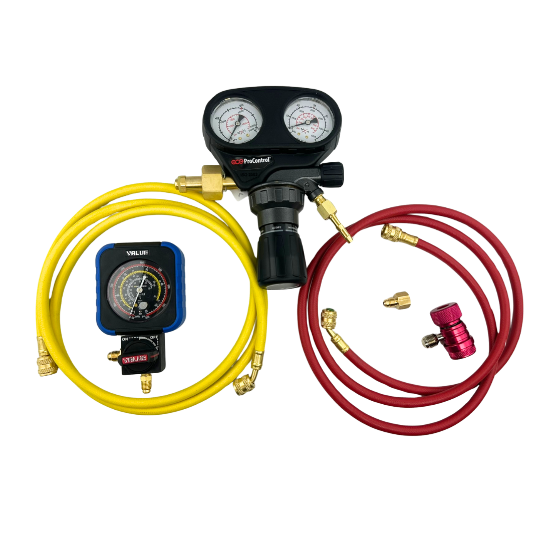 Kompletny zestaw serwisowy zaprojektowany do testowania szczelności układów klimatyzacji samochodowej przy użyciu azotu. Dzięki wykorzystaniu azotu jako medium testowego można szybko i bezpiecznie sprawdzić szczelność instalacji przed napełnieniem jej czynnikiem chłodniczym, co pozwala uniknąć kosztów związanych z utratą czynnika oraz wykryć nieszczelności we wczesnej fazie serwisu — to popularna i skuteczna metoda diagnostyczna stosowana przez mechaników i serwisantów układów A/C.