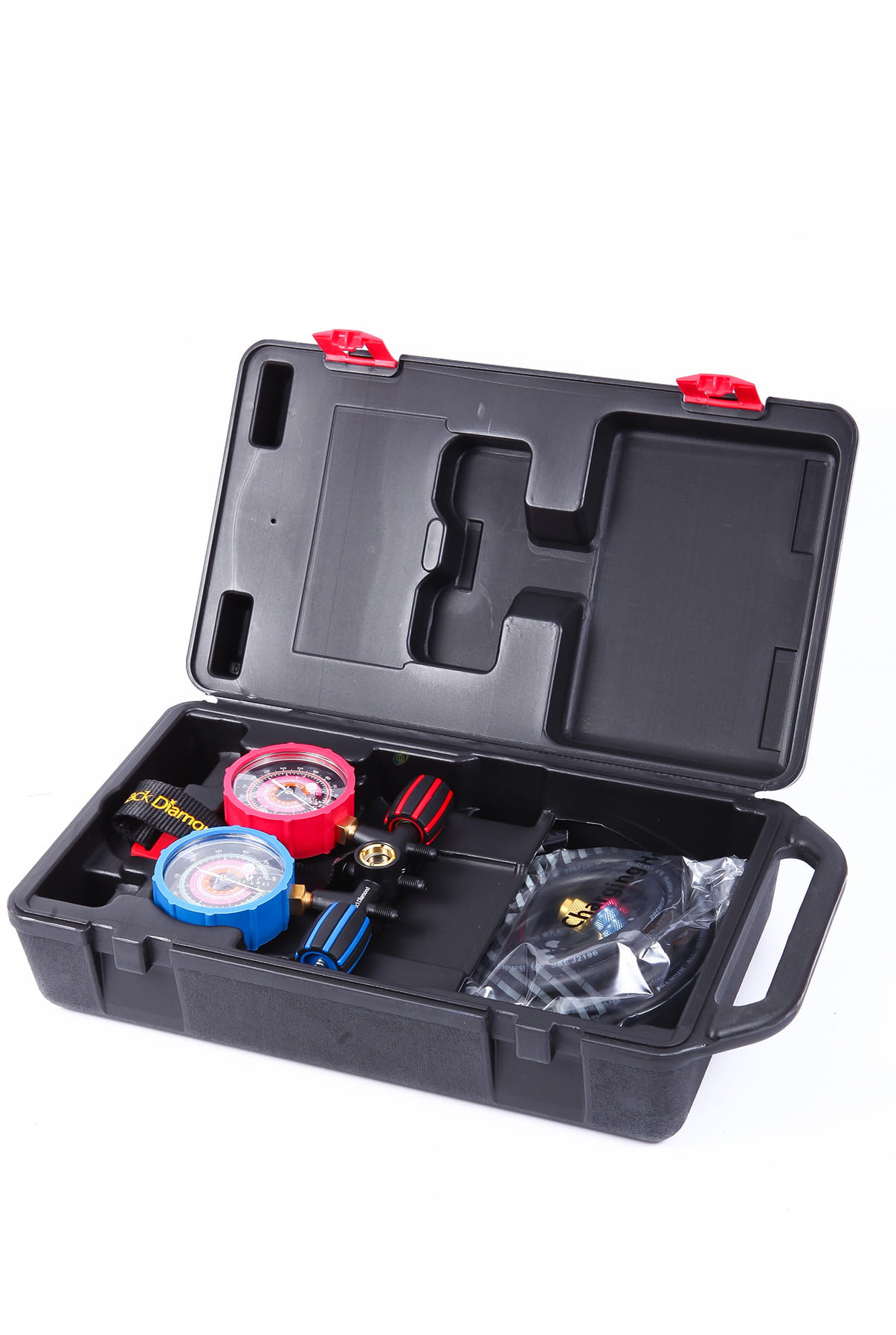 - dwa manometry o średnicy 80 mm (klasa jakości 1.6) ze skalą na czynniki R32, R410a, R407c w gumowej osłonie