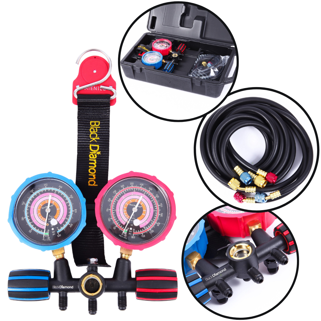 Zestaw manometrów BLACK DIAMOND z 3 wężami na gazy R32, R410a, R407c