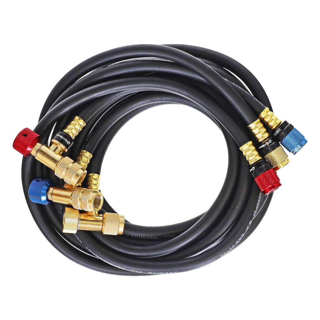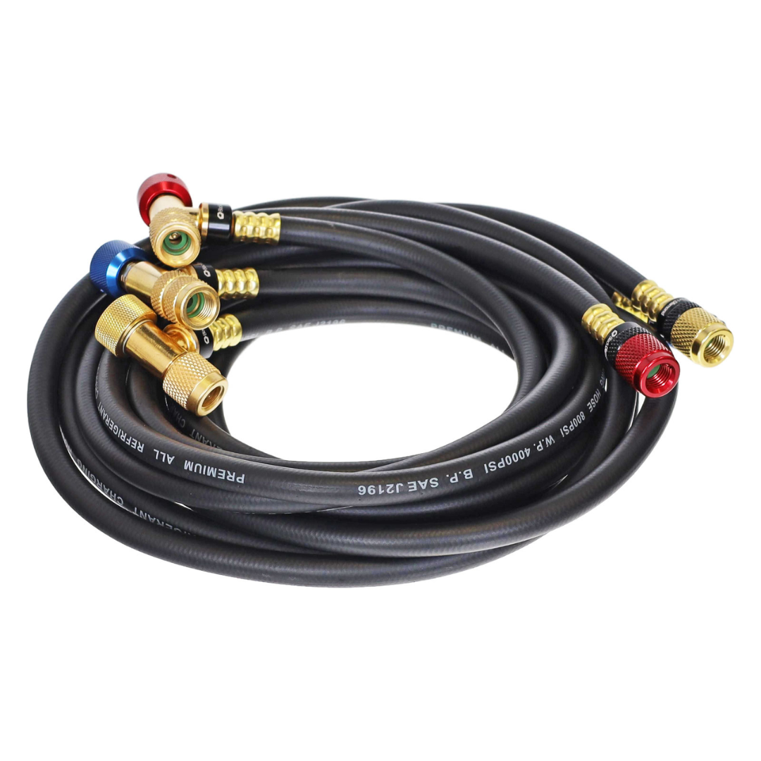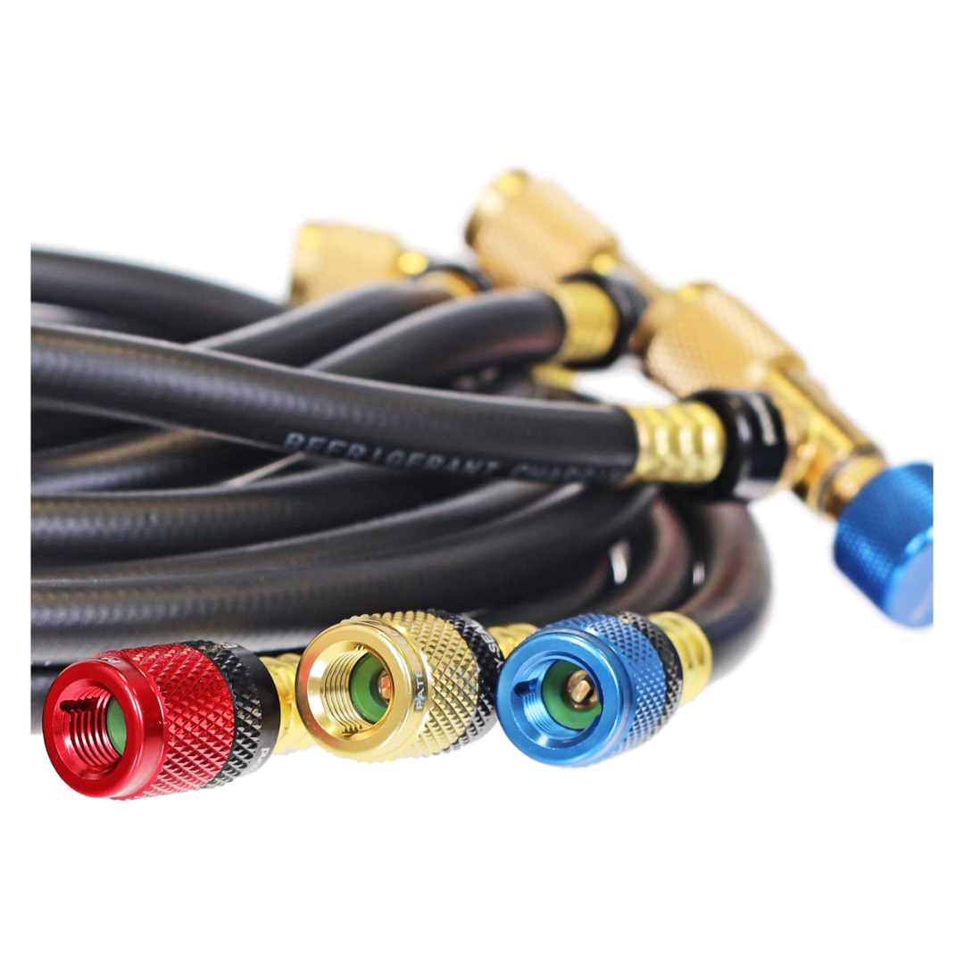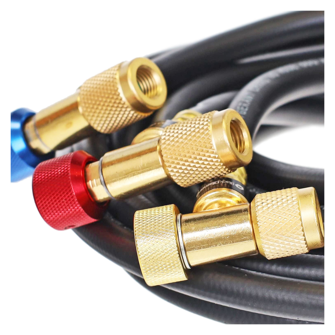 Integracja zaworków odcinających: Węże ciśnieniowe wyposażone są w innowacyjne zawory z ruchomym popychaczem, który skutecznie otwiera zawory serwisowe. To rozwiązanie minimalizuje ryzyko wycieku czynnika chłodniczego i zwiększa bezpieczeństwo pracy serwisanta.